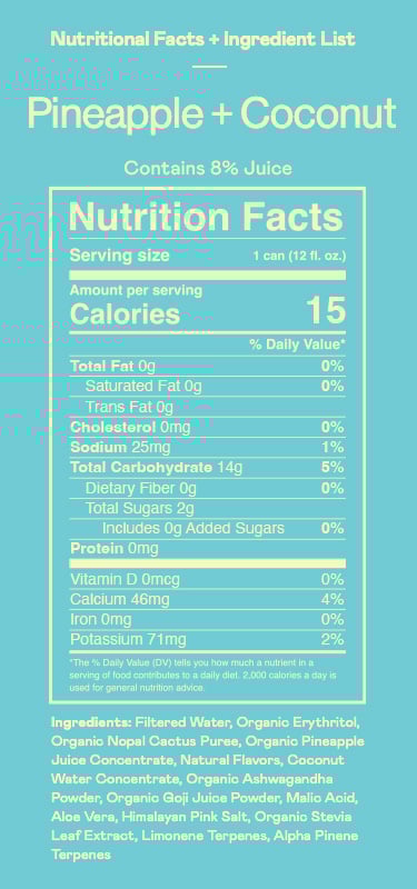 A tropical escape and likely your new favorite hydration drink, Pineapple + Coconut is light, refreshing, and the perfect drink to support hydration, balance, and recovery. It’s so delicious that you won’t believe it’s packed with good-for-ingredients and only has 2g of sugar and 15 calories.